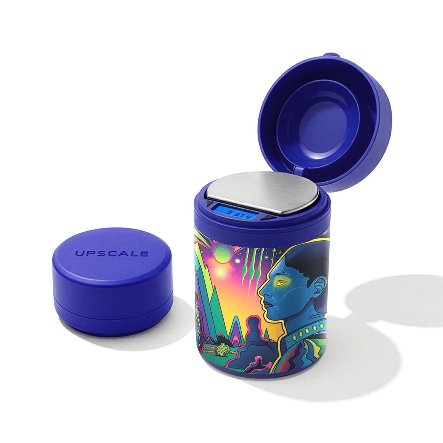 We don’t do boring jars. Upscale is the world’s first container jar + scale, so you can stash fresh, pop the tray, and weigh on demand—no extra gear, no guesswork. Detachable tray, humidity-pack pocket, USB recharge, and artwork that goes hard. Less mess. More precision. Big flex.
